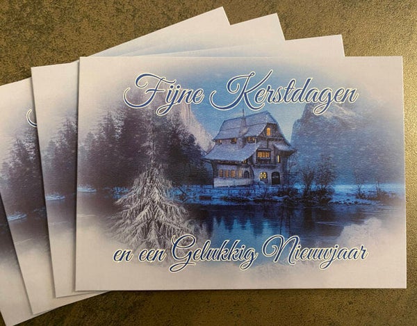 Dubbele Kerstkaart landschap en met witte envelop.De buitenkant van de kaart is mat, de binnenkant is beschrijfbaar.Formaat 148 x 105 mm.