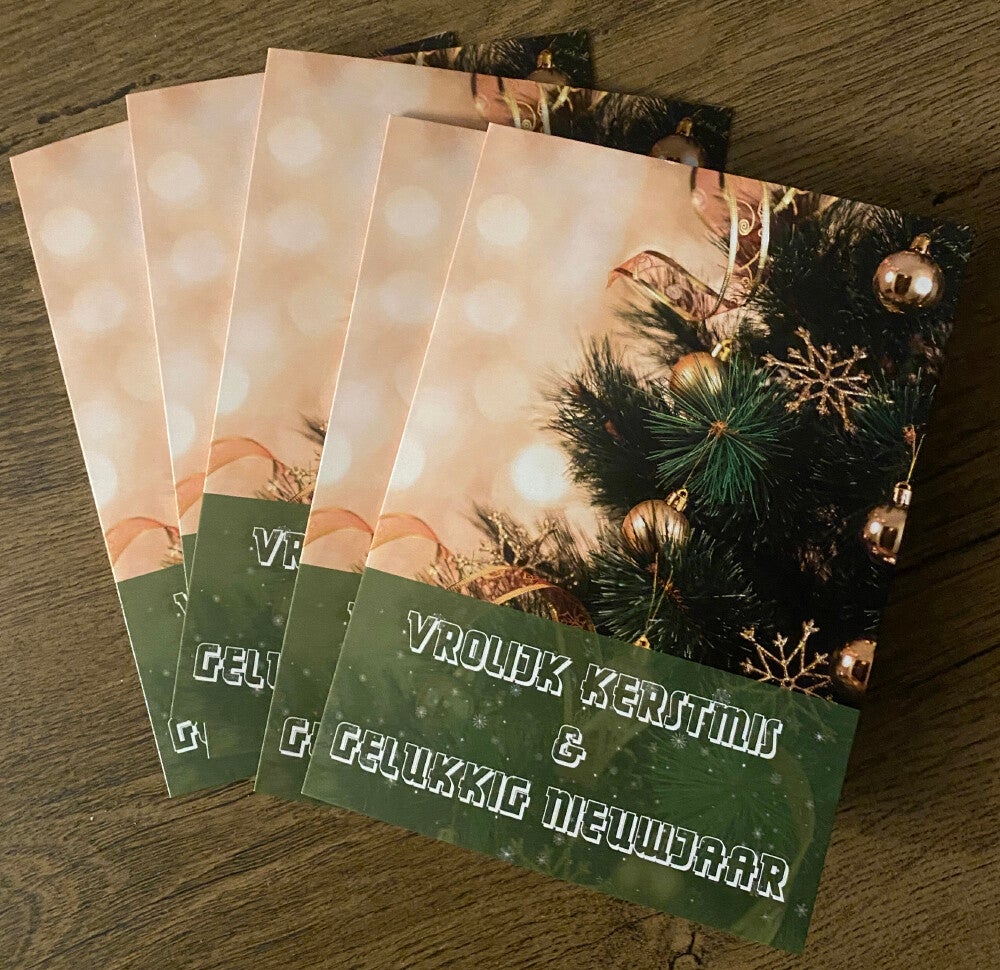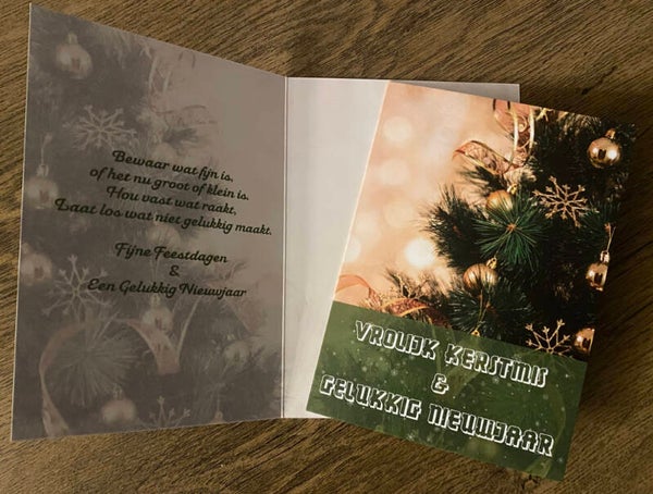 Dubbele Kerstkaart met kerstboom en met witte envelop.De buitenkant van de kaart is mat, de binnenkant is beschrijfbaar.Formaat 148 x 105 mm.